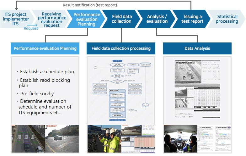 ITS Korea as a dedicated ITS performance evaluation agency (designated by the Ministry of Land, Infrastructure and Transport) evaluates ITS equipment and systems. Performance evaluation includes the completion evaluation, regular evaluation, change and relocation evaluation for the systems such as vehicle detection system (VDS), automatic vehicle identification (VDI), DSRC traffic information system, incident detection system (AIDS) and high speed weigh-in-motion (HS-WIM). In particular, ITS Korea is an inspection body accredited by KOLAS for VDS and AVI providing more reliable performance evaluation service.